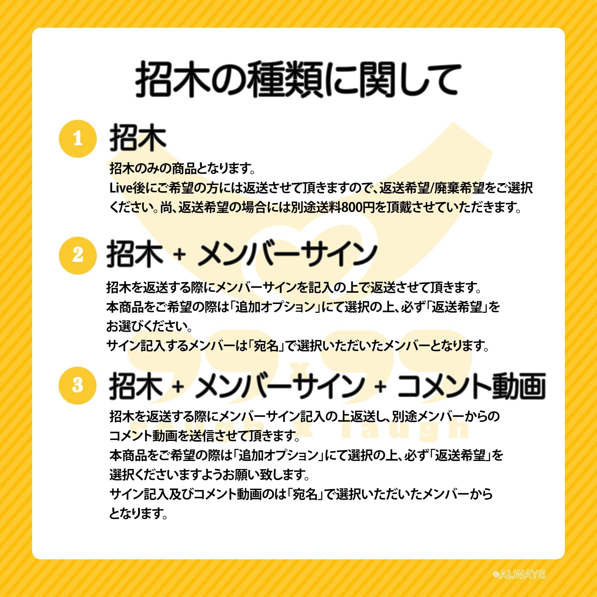 返送の際にご購入いただいた招木にメンバーがサインを記入、さらに別途コメント動画をお送りいたします。